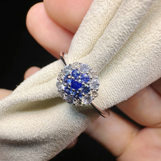 K18 White Gold Sapphire and Diamond Flower Ring|Vintage Japanese Cluster Jewelry|2.8g