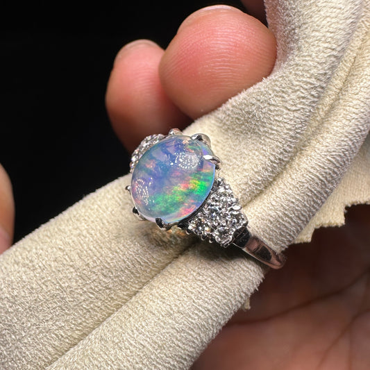 14K Gold Natural Opal Ring – Vintage Oval Rainbow Opal with Diamond Accents | Fine Japanese Estate Jewelry