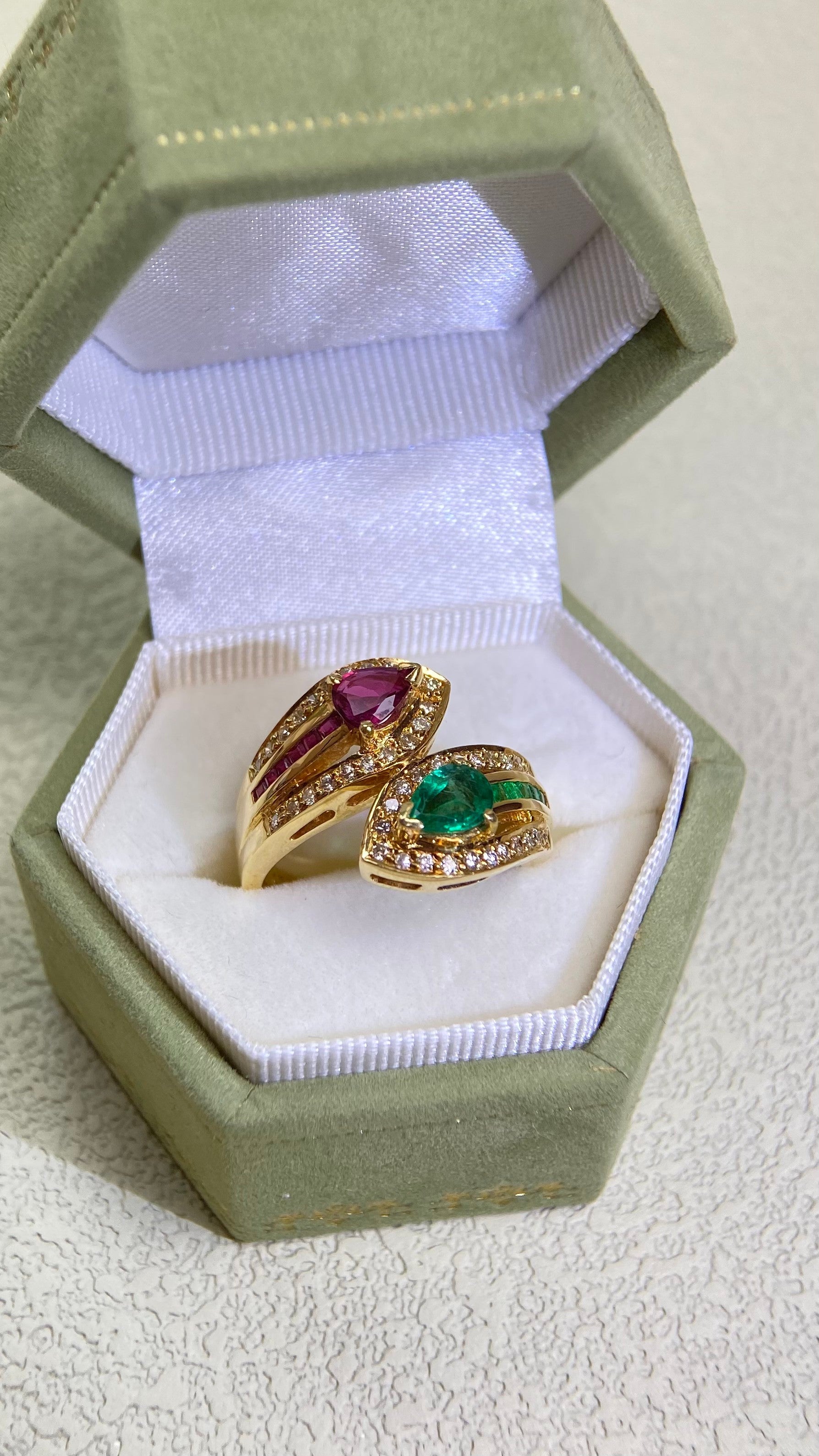 K18ゴールド&ルビー&エメラルド&ダイヤモンドリング|ルビー0.38ct|エメラルド0.43ct|ダイヤモンド0.28ct|日本製ヴィンテージエステートジュエリー-BRCE