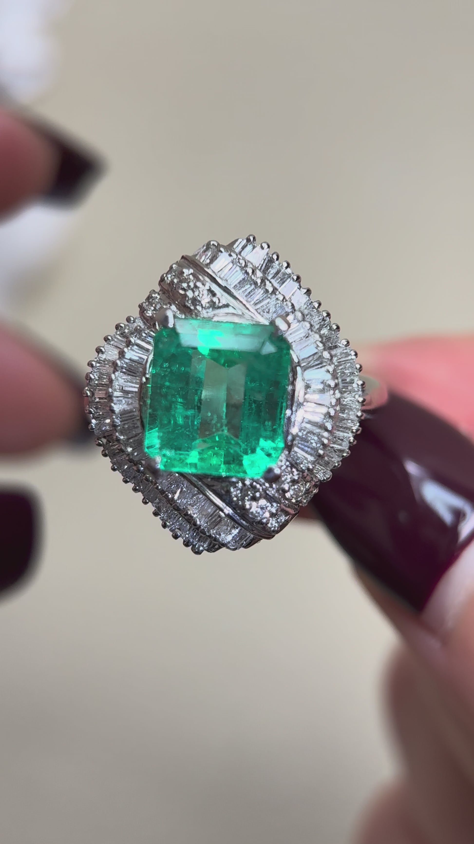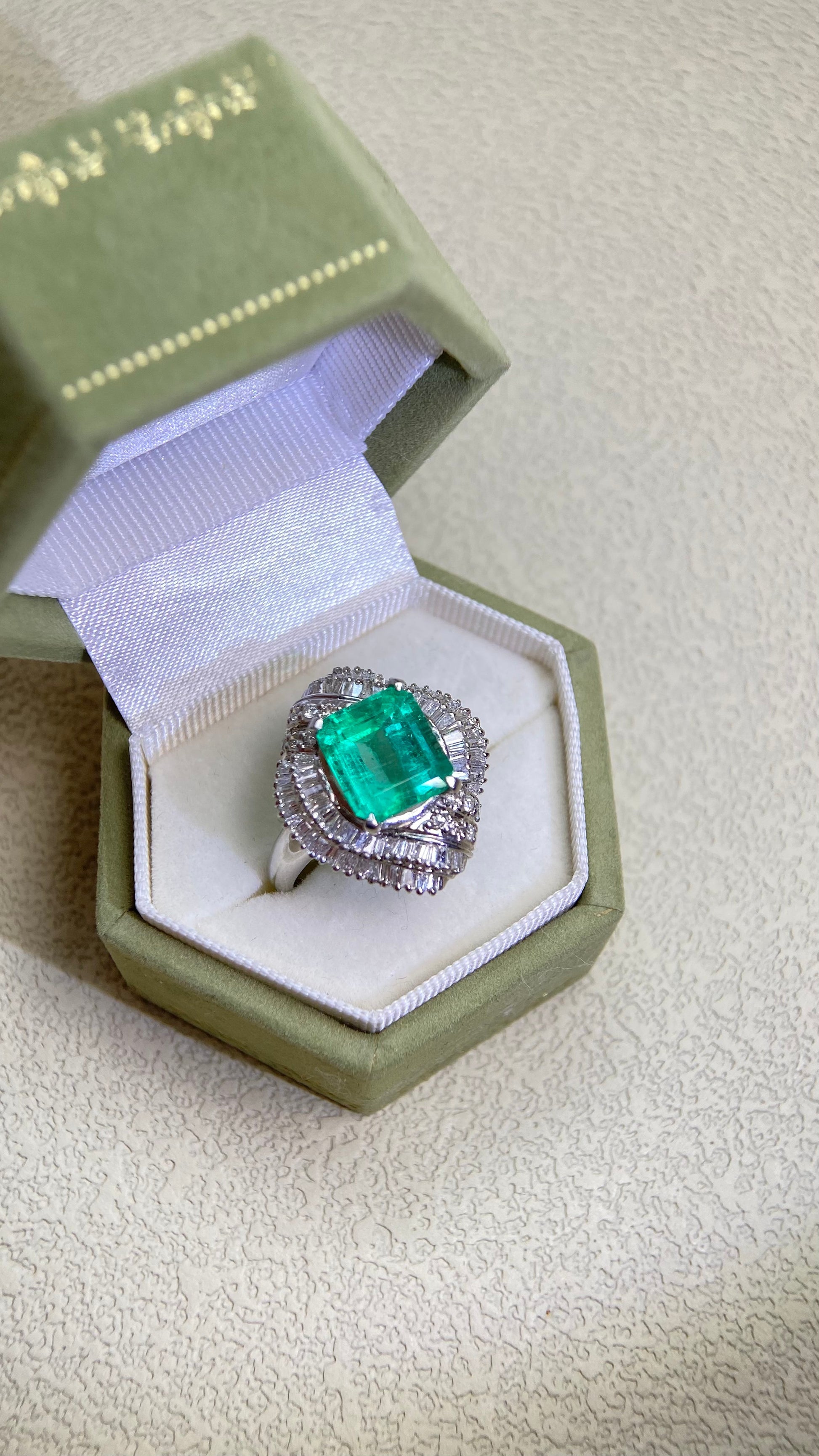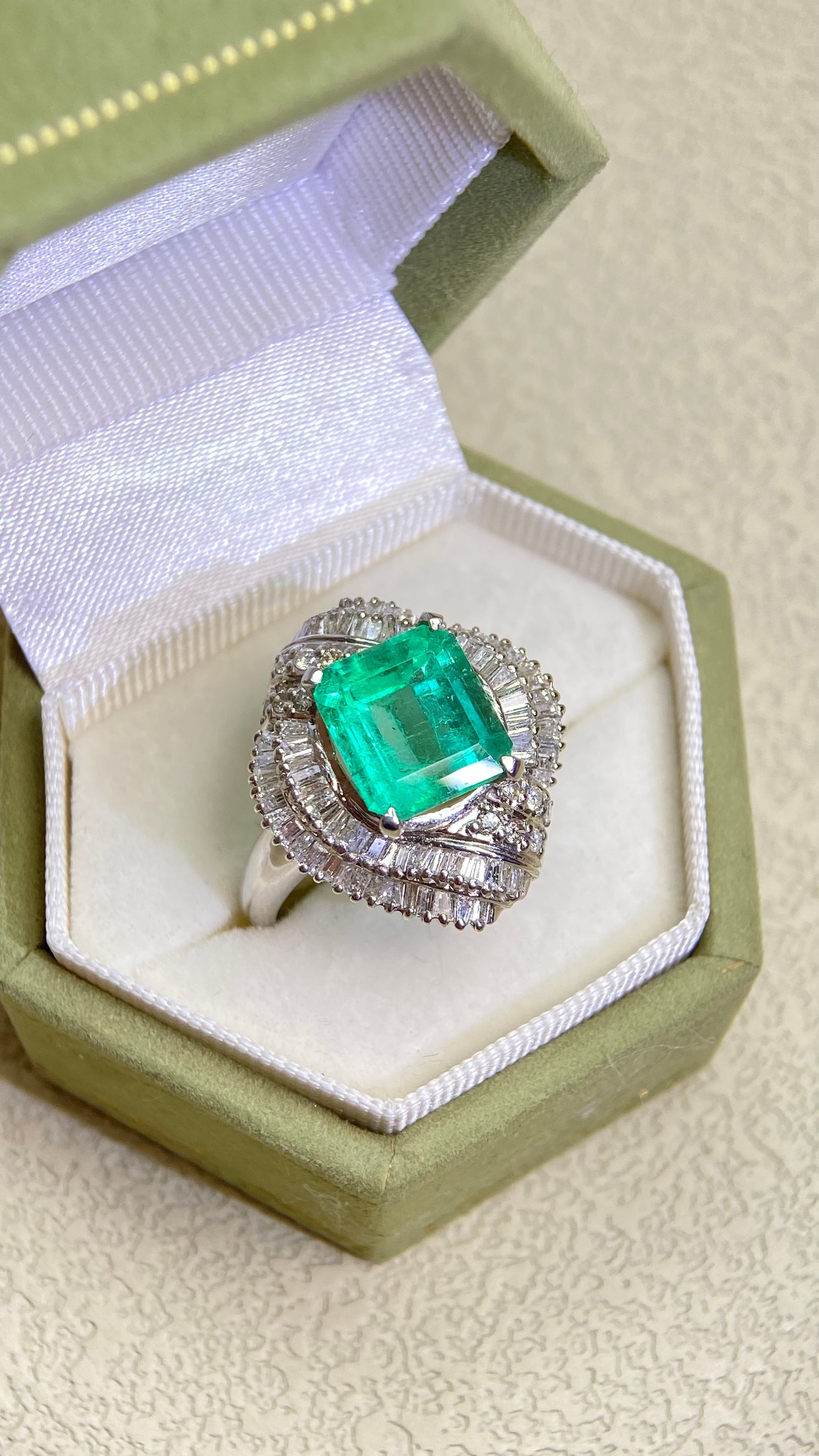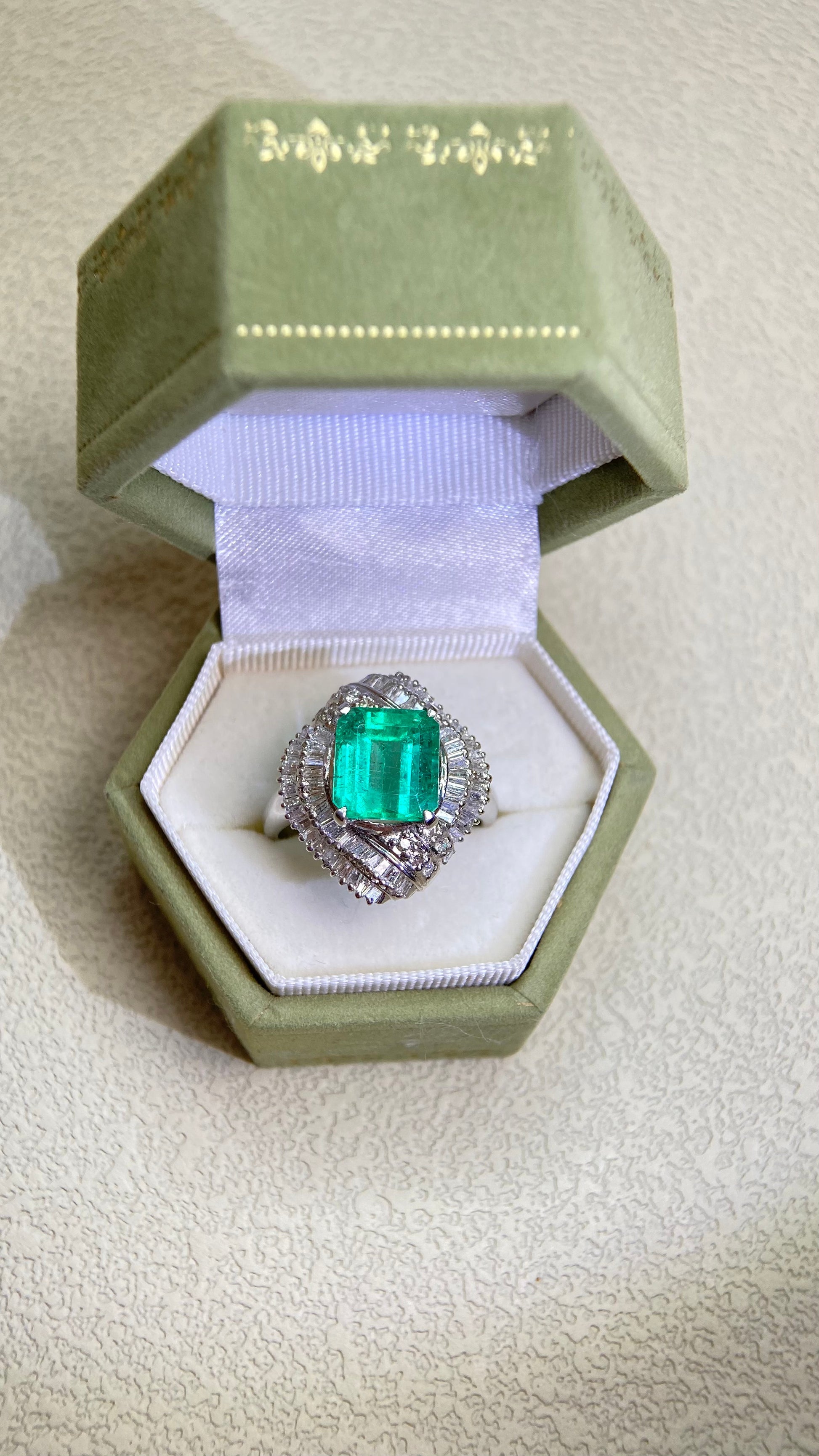Pt900プラチナ&エメラルド&ダイヤモンドリング|エメラルド3.49カラット|ダイヤモンド1.00カラット|日本製ヴィンテージエステートジュエリー-BBZW