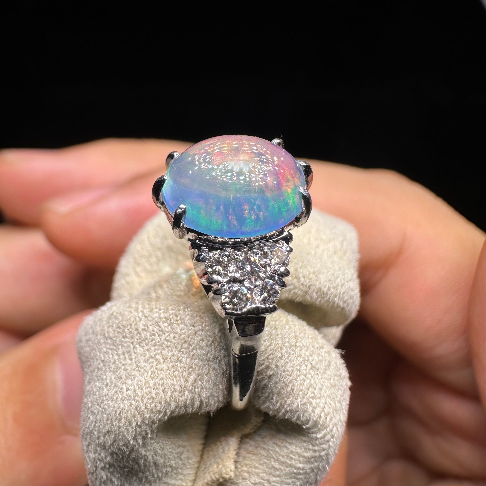 14K Gold Natural Opal Ring – Vintage Oval Rainbow Opal with Diamond Accents | Fine Japanese Estate Jewelry