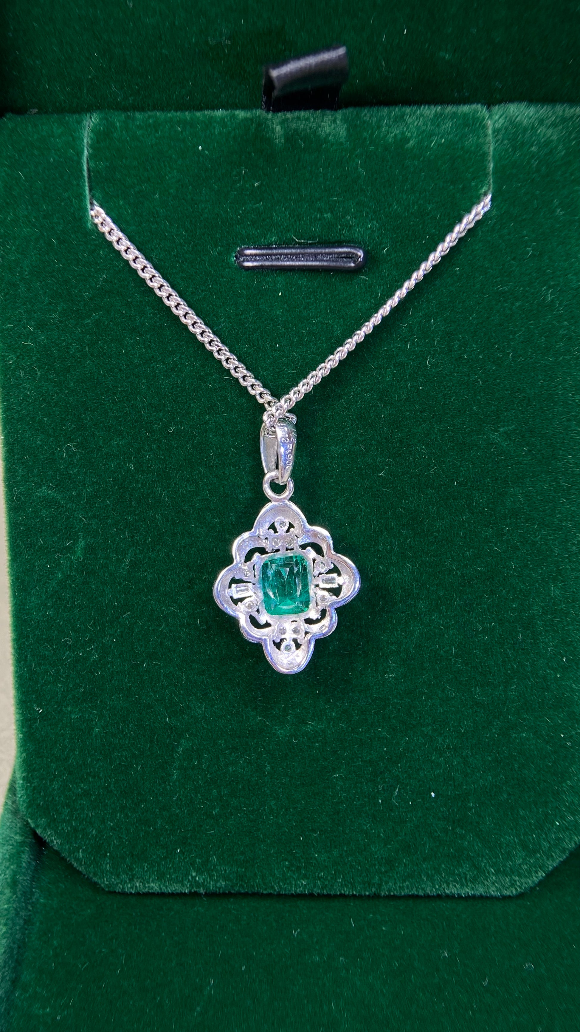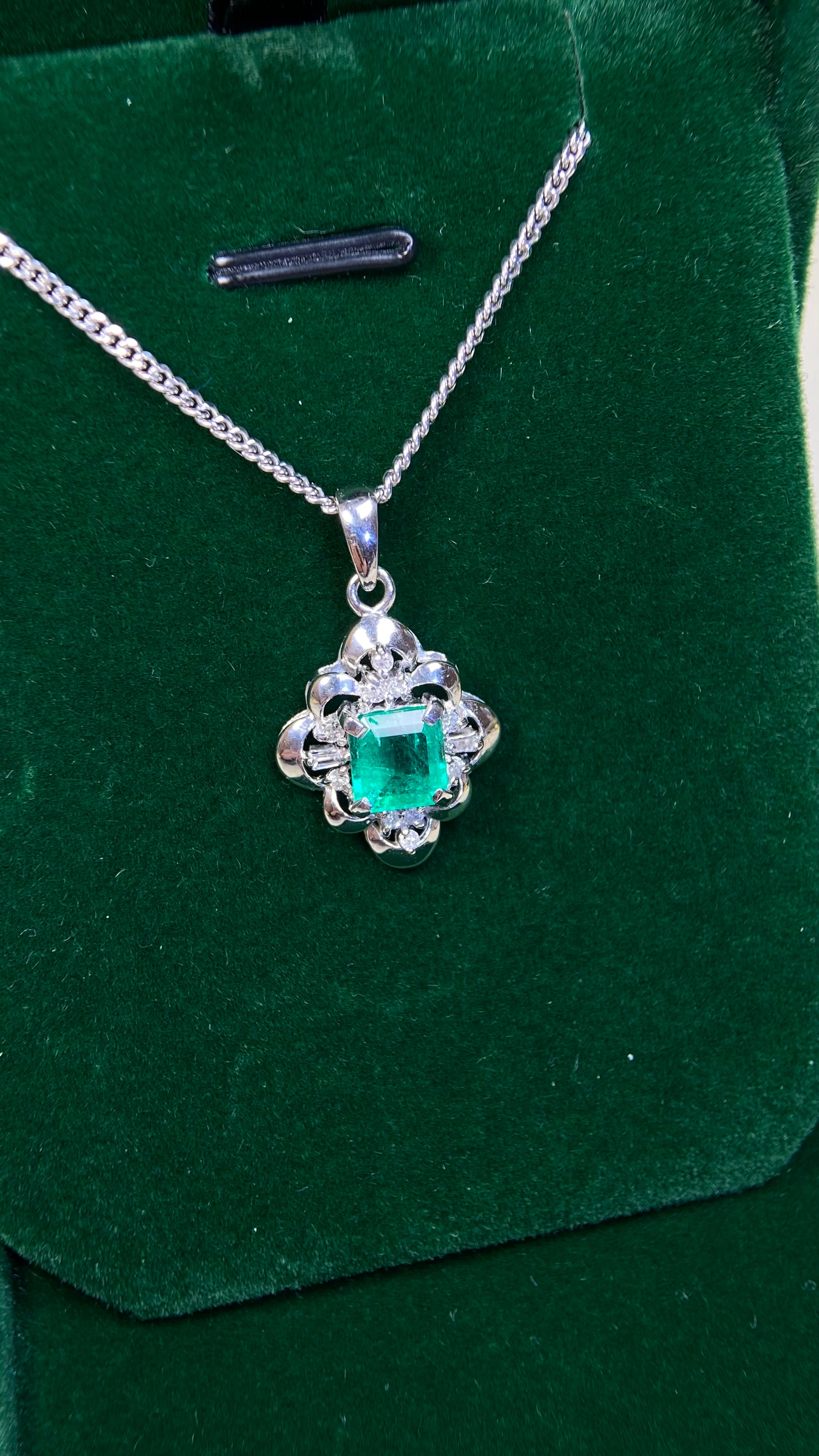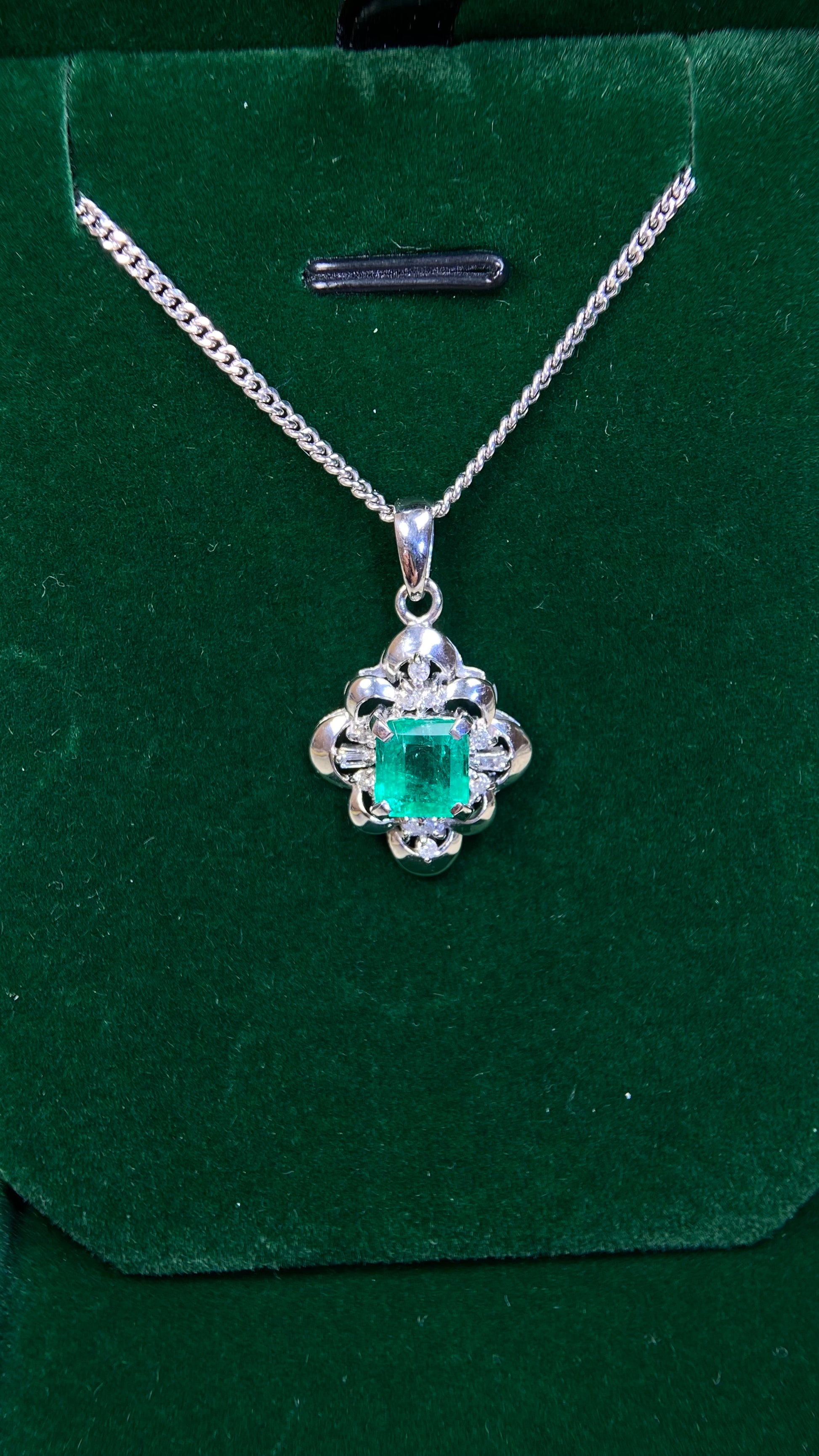 Pt900 platinum/Pt850 platinum&Emerald&Diamond Necklace| Emerald: 1.12ct|Diamonds:0.12ct|Japanese Vintage Estate Jewelry -BQNU